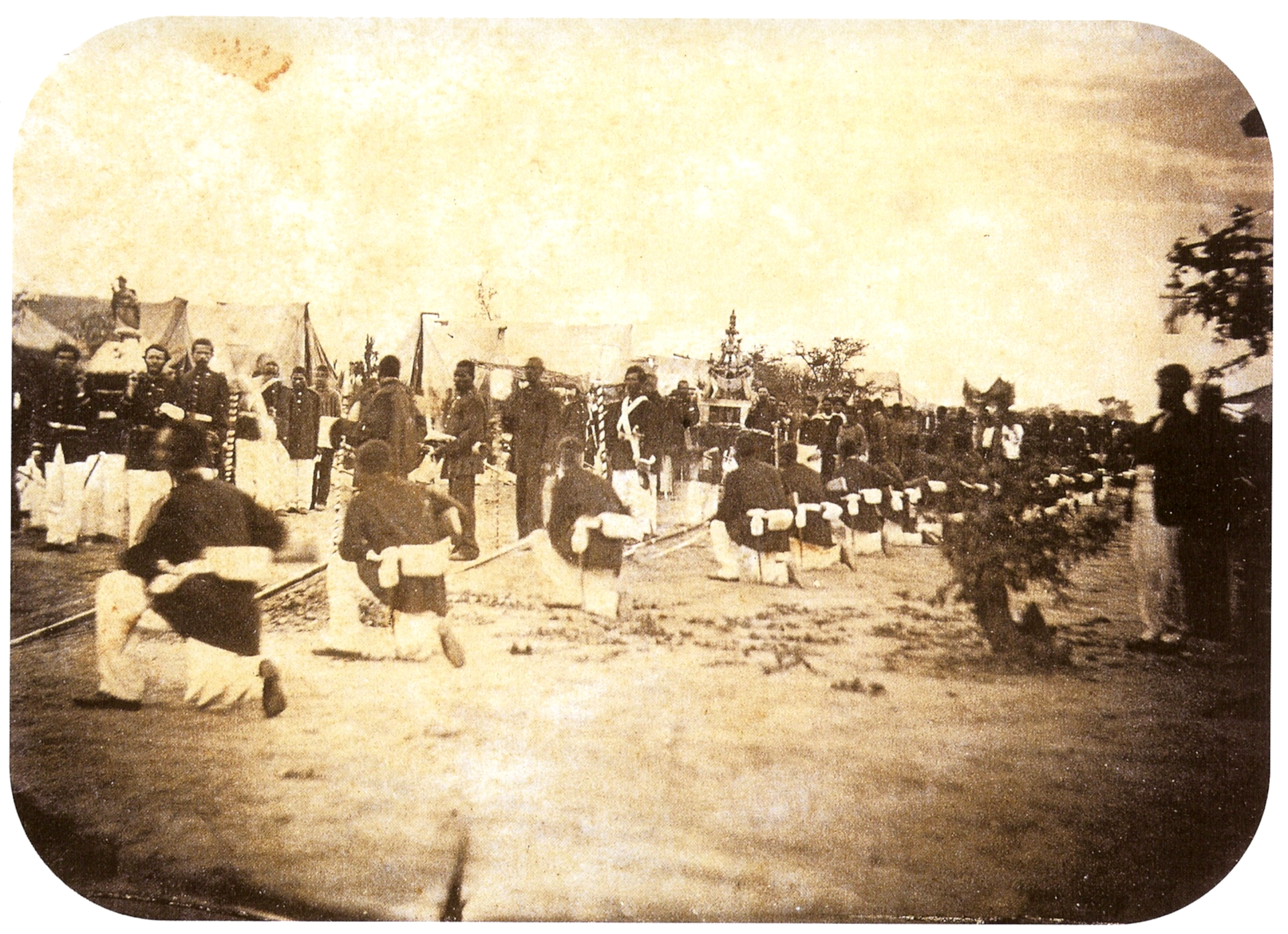 Tocava-se depois: ajoelhar corpos. Todos aqueles homens simples, rudes e cheios de fé, que iam bater-se como leões, no dia seguinte, puseram-se de joelhos, e com as mãos musculosas, apertando os largos peitos valorosos, entoaram, cheios de contrição e de fé, o “Senhor Deus, misericórdia, Senhor Deus pequei, Senhor misericórdia. Senhor Deus, por nossa Mãe Maria Santíssima, misericórdia”. Logo depois começavam a rezar o terço.[2]