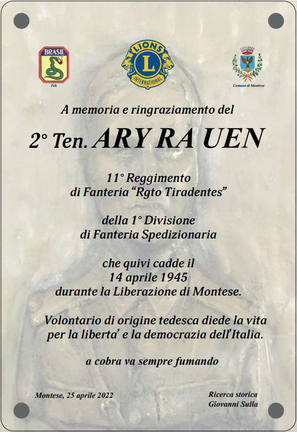 Por iniciativa do pesquisador italiano Giovanni Sulla, foi inaugurada em Montese, em 25 de abril de 2022, uma placa em memória do 2º tenente Ary Rauen, oficial comandante do 2º pelotão pertencente à 1ª Cia do I Batalhão do 11º Regimento de Infantaria. “Voluntário de origem tedesca que deu a vida para a liberdade e a democracia da Itália”, diz a inscrição na placa. Nosso blog teve o privilégio de contribuir para essa pesquisa histórica.