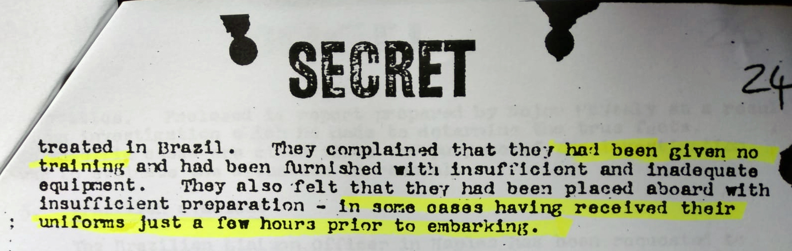 Pior, alguns soldados dos derradeiros escalões da FEB sequer aprenderam a usar corretamente os uniformes. Um relatório secreto do Destacamento de Ligação dos EUA trouxe o testemunho do coronel Júlio Prestes, Oficial de Ligação brasileiro em Nápoles: “Em alguns casos receberam os uniformes apenas algumas horas antes do embarque”.
