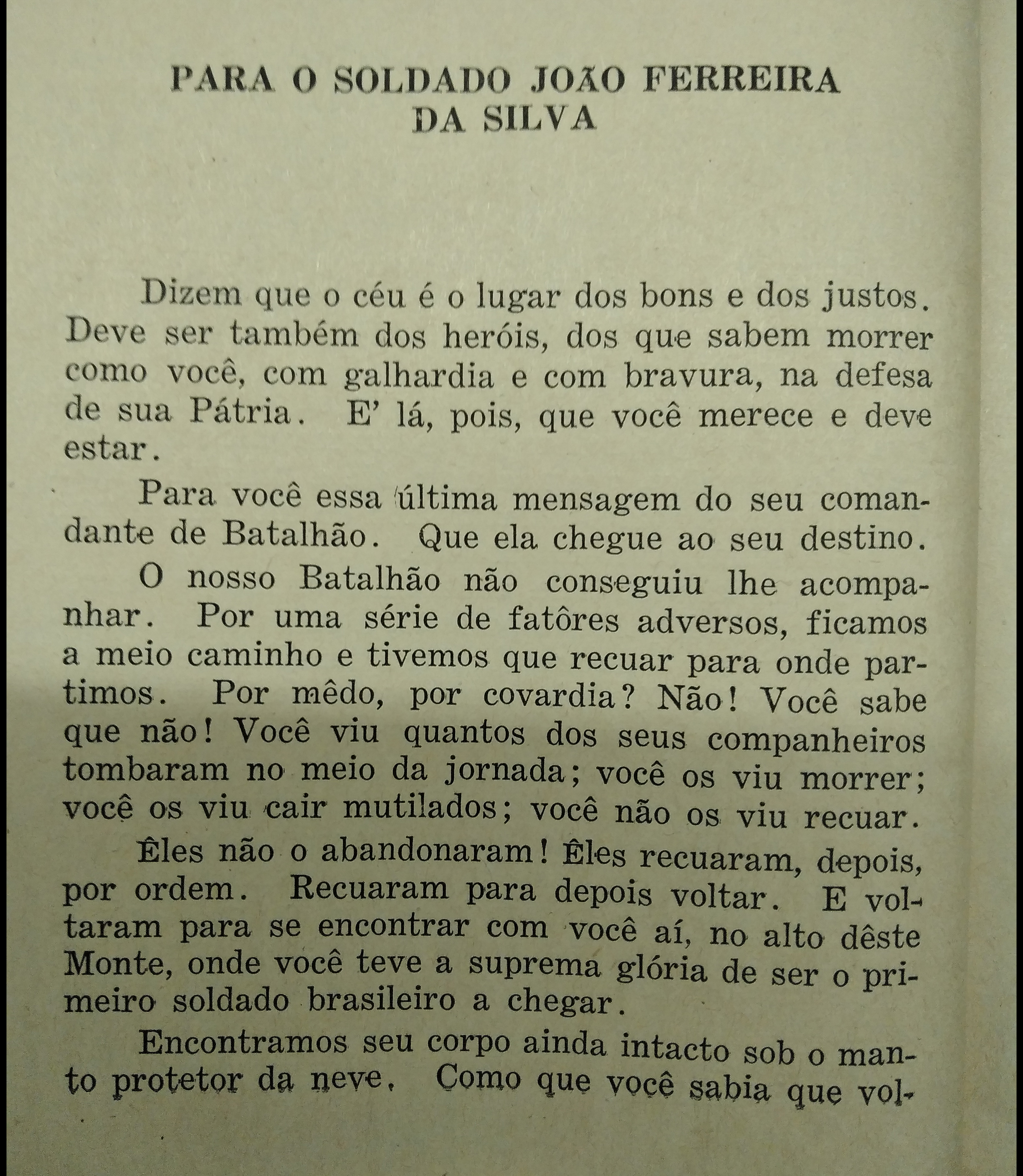 Por limitação do tempo disponível, não foi possível incluir a menção do coronel Olívio Gondim de Uzêda (comandante do I Batalhão do Regimento Sampaio), presente em seu livro Crônicas de Guerra (Bibliex -1952). A menção especial de Uzêda ao soldado sergipano João Ferreira da Silva foge ao padrão de sobriedade da historiografia da Força Expedicionária Brasileira. É o elogio sincero e emocionado de um comandante ao seu subordinado de valentia sobrenatural: o “Conquistador Solitário do Monte Castello”.