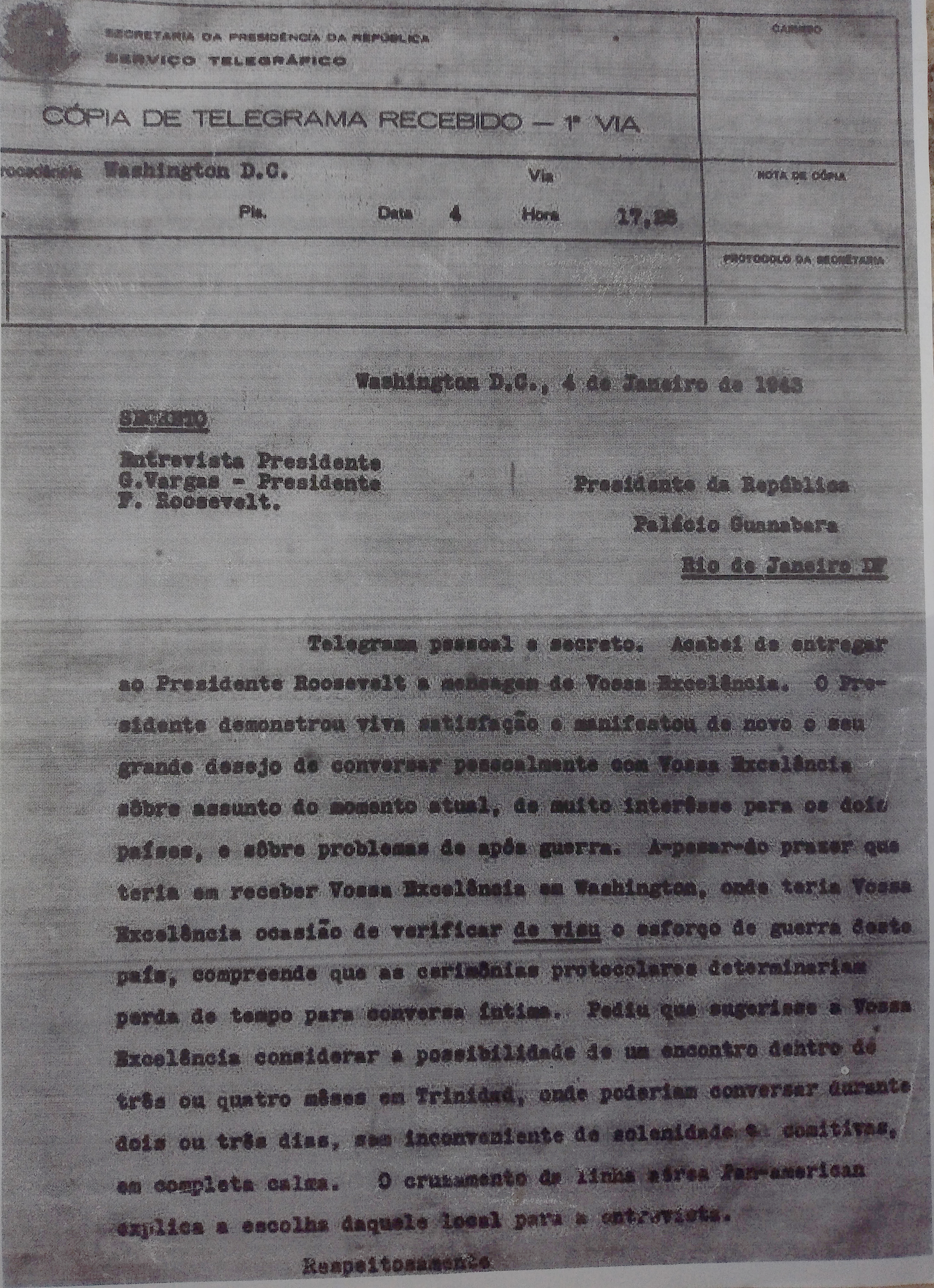 “Acabei de entregar ao presidente Roosevelt a mensagem de Vossa Excelência. O presidente demonstrou viva satisfação e manifestou de novo o seu grande desejo de conversar pessoalmente com Vossa Excelência sobre assunto do momento atual, de muito interesse para os dois países”.