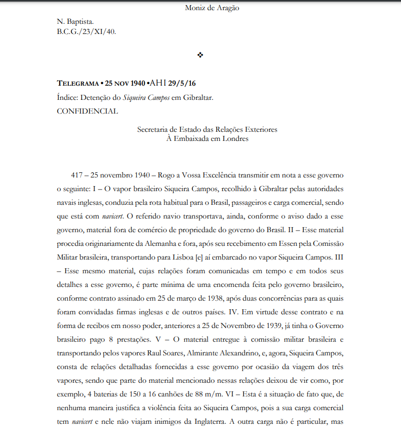 A séria crise diplomática anglo-brasileira de 1940–41 deixara sequelas na relação militar entre os dois países. Em 1944, um relatório secreto americano apontou que “as mágoas persistem entre os brasileiros, devido ao dano à dignidade nacional, quando, em 1941, a Marinha britânica deteve em Gibraltar um navio brasileiro (o vapor Siqueira Campos) , fazendo buscas na embarcação que trazia o general Gustavo Cordeiro de Farias, chefe da Comissão de Compras na Alemanha”. Para o assombro dos militares nacionais, os ingleses preferiam manter na Europa — de posse da Alemanha nazista — fornida carga de canhões modernos e outros materiais de guerra da Krupp, ao invés de permitir sua entrega ao Brasil.