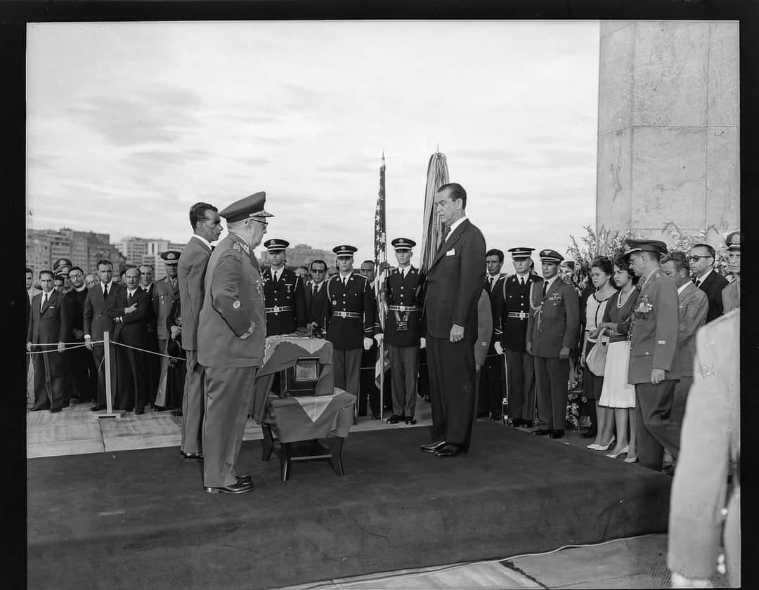 Porém, quando o cortejo chegou ao monumento, o instrumento emudeceu. Lá estava o presidente da República, Juscelino Kubistchek, os aguardando. Uma urna com os despojos de um soldado brasileiro não identificado foi entregue pelo ex-comandante da FEB, marechal Mascarenhas de Moraes, ao Presidente da República, que a depositou na base do Pórtico Monumental.