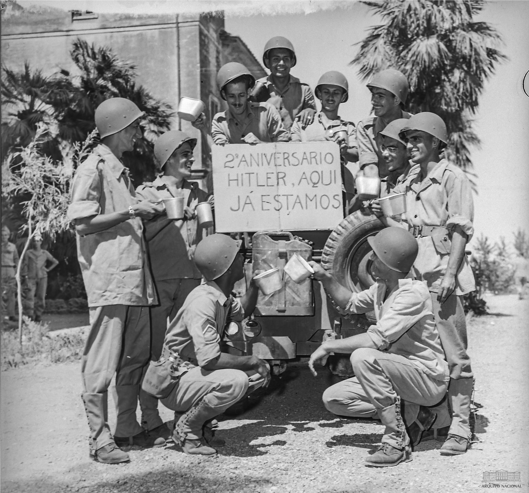 O dia seguinte marcou o 2º aniversário do reconhecimento do Estado de Beligerância do Brasil com a Alemanha e a Itália. Um fotógrafo da Agência Nacional registrou a foto icônica de dez alegres soldados em Villa Graziani (QG da FEB); dois deles estão na traseira de um jipe segurando uma placa com a inscrição: “2º Aniversário / Hitler, aqui já estamos” (foto abaixo).