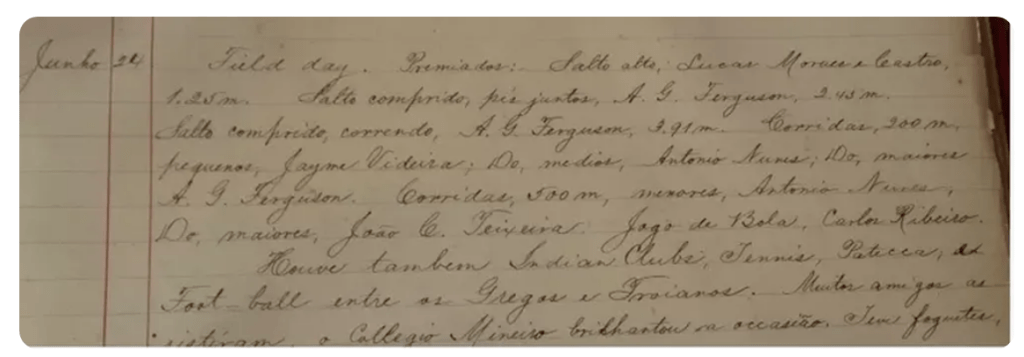 Outra citação, de 24 de junho do mesmo ano, aponta a realização de um Field day com “Foot-ball entre os Gregos e Troianos” — tudo isso dois anos antes de Charles Miller organizar o que é considerado o primeiro jogo no Brasil.