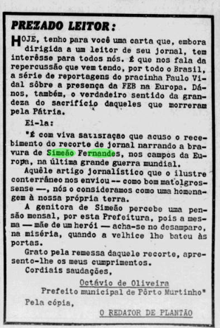 É com com viva satisfação que acuso o recebimento do recorte de jornal narrando a bravura de Simeão Fernandes, nos campos da Europa, na última grande guerra mundial.
