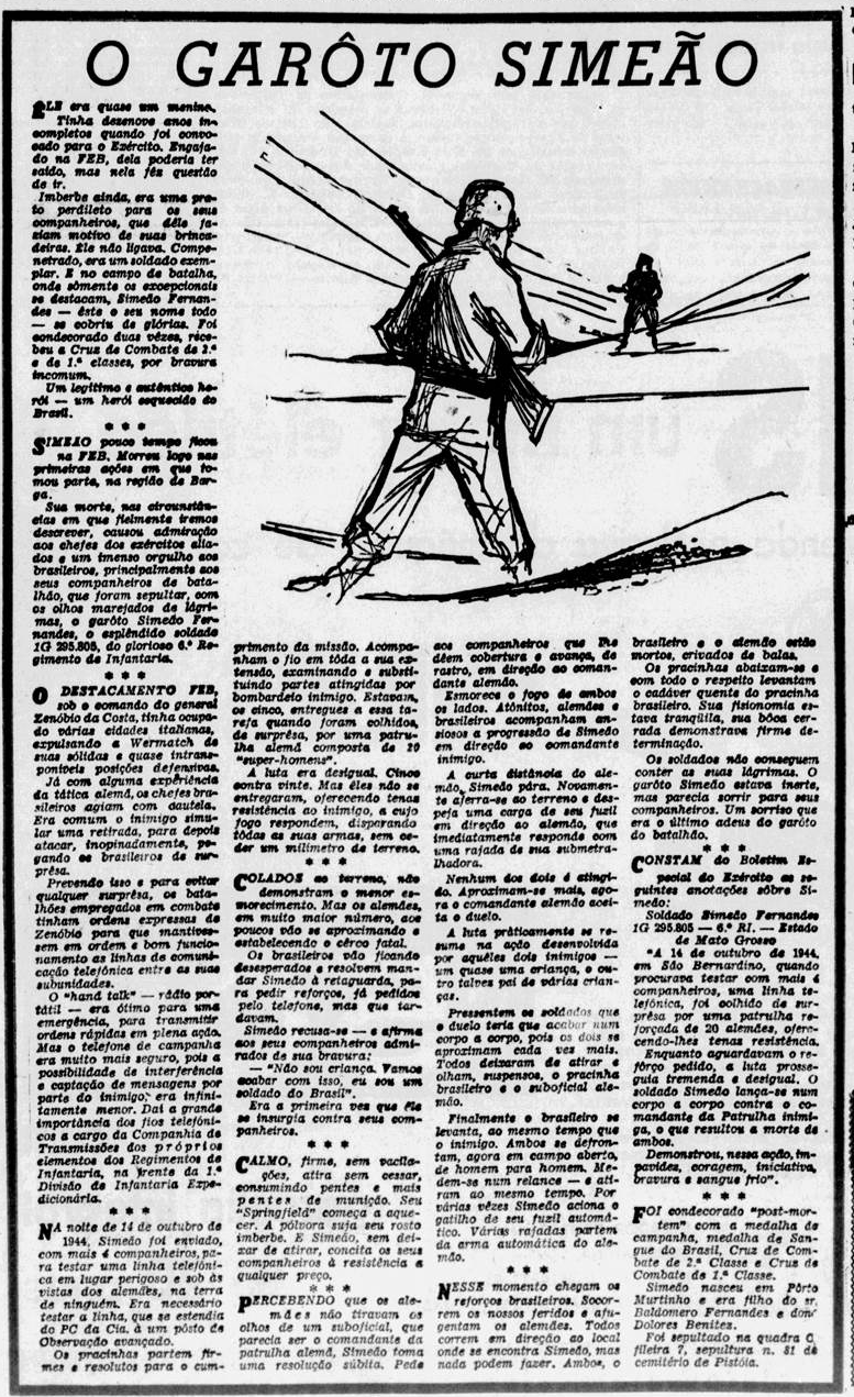 Um legitimo e autêntico herói — um herói esquecido do Brasil. Simeão pouco tempo ficou na FEB. Morreu logo nas primeiras ações em que tomou parte, na região de Barga. Sua morte, nas circunstâncias em que fielmente iremos descrever, causou admiração aos chefes dos exercitos aliados e um imenso orgulho aos brasileiros, principalmente aos seus companheiros de batalhão, que foram sepultar, com os olhos marejados de lágrimas, o garoto Simeão Fernandes, o esplêndido soldado 1G 295.805, do glorioso 6º Regimento de Infantaria.