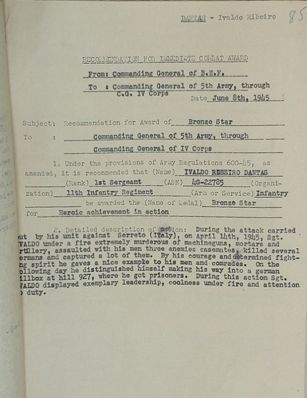 Outro exemplo comovente é o do 1º Sargento Ivaldo Ribeiro Dantas, da 8ª Companhia do III Batalhão do 11º RI. Herói da Batalha de Montese, foi condecorado com a Bronze Star por sua bravura no ataque a Serreto. Consta nas suas alterações: