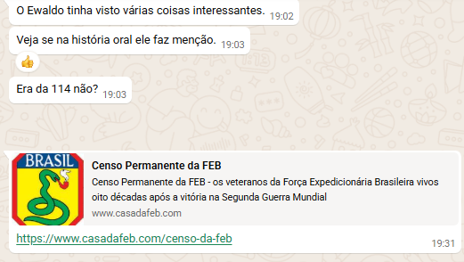 Anteontem (4/2/2026), ele me enviou um áudio pelo WhatsApp, narrando uma história que ouvira do 3º sargento Ewaldo Meyer — apontado por muitos como o idealizador e desenhista da célebre “Cobra Fumando”. Contou, com entusiasmo, o episódio em que um tenente alemão aprisionado afrontou seus captores e recebeu, em resposta, uma bordoada na orelha. A partir da data do ocorrido, cruzamos informações até chegarmos ao nome do personagem: o tenente Klaus Dietrich Polz — até então incógnito na historiografia febiana havia oitenta anos.